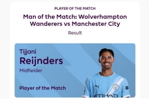 賽后據(jù)英超官方消息,曼城中場賴因德斯以52%的得票當選此役全場最佳球員。