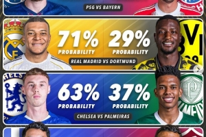 體育資訊7月2日訊 本屆世俱杯8強(qiáng)全部產(chǎn)生,Score90也對(duì)8強(qiáng)戰(zhàn)結(jié)果進(jìn)行了概率分析,具體如下: