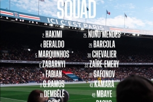 后衛(wèi):2-阿什拉夫、4-貝拉爾多、5-馬爾基尼奧斯、6-扎巴爾尼、21-盧卡斯-埃爾南德斯、25-努諾-門德斯、43-卡馬拉、51-帕喬
