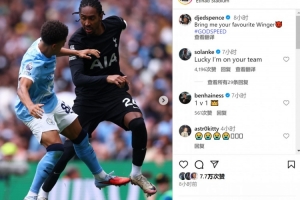 此役熱刺邊衛(wèi)斯賓塞踢滿全場,幫助球隊取勝,賽后他在社交媒體上曬出比賽照片,并配文:“讓你們最喜歡的邊鋒放馬過來!”展現(xiàn)自己不懼對抗的自信。