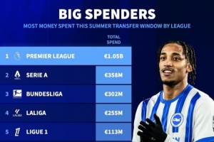 德轉(zhuǎn)列今夏各聯(lián)賽支出榜:歐元