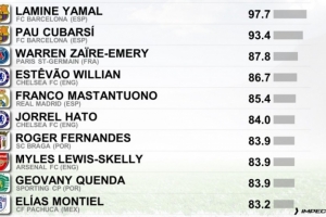 體育資訊8月28日訊 CIES(瑞士足球天文臺(tái))評(píng)出今年非門將U20球員的表現(xiàn),亞馬爾成為評(píng)分最高的球員,庫巴西第二。