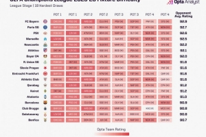 Opta使用個(gè)球隊(duì)的實(shí)力排名體系進(jìn)行分析(該體系將全球1.3萬支球隊(duì)納入同一評估標(biāo)準(zhǔn)進(jìn)行排名,得分越高的球隊(duì)實(shí)力越強(qiáng)),對每支歐冠參賽隊(duì)的8個(gè)對手取平均分,算出來數(shù)值越高的證明對應(yīng)的賽程越困難, 結(jié)果1-18名的排名如下: