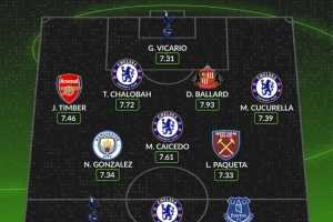 后衛(wèi):廷伯(阿森納,7.46分)、查洛巴(切爾西,7.72分)、丹尼爾-巴拉德(桑德蘭,7.93分)、庫庫雷利亞(切爾西,7.39分)