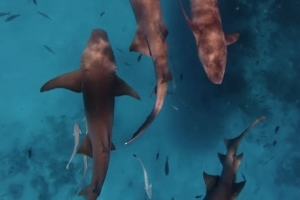 視頻中,庫巴西潛入海中游泳,并和一群鯊魚進行互動。