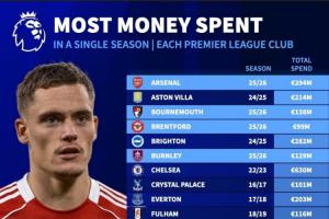 阿森納、伯恩茅斯、布倫特福德、伯恩利、利物浦、曼聯(lián)、紐卡、諾丁漢森林、桑德蘭共9支球隊都已創(chuàng)造了各自球隊單賽季引援花費的歷史紀(jì)錄。