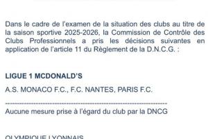 根據(jù)對2025-2026賽季職業(yè)俱樂部狀況的審查,職業(yè)俱樂部監(jiān)管委員會依據(jù)DNCG章程第11條作出如下決定: