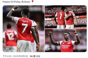 阿森納官方社媒曬出薩卡的照片,配文:“我們的7號(hào),生日快樂(lè),布卡約(薩卡)!”