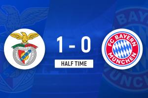上半場(chǎng)傷停補(bǔ)時(shí)4分鐘,半場(chǎng)結(jié)束,本菲卡暫1-0拜仁。