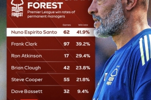 體育資訊9月9日訊 諾丁漢森林官宣努諾下課,根據數據統(tǒng)計努諾是森林隊史英超勝率最高的主帥。