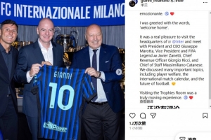 因凡蒂諾寫道:我這次的經(jīng)歷可以用“回家”來形容。非常榮幸能訪問國米總部,并與俱樂部CEO馬洛塔、副主席兼國際足壇傳奇薩內(nèi)蒂、首席營收官喬治-里奇以及首席參謀馬克西米里亞諾-卡塔內(nèi)塞會面。我們討論了許多重要議題,包括球員福祉、國際比賽日賽程以及足球的未來等等。參觀俱樂部榮譽(yù)室是一次深受觸動的經(jīng)歷!