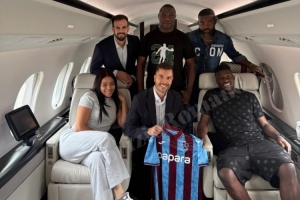 羅馬諾社媒曬出奧納納與家人、經(jīng)紀(jì)人在飛機上展示特拉布宗體育球衣的照片。