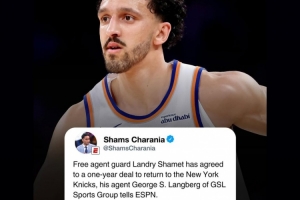 體育資訊9月12日訊 據(jù)名記Shams報(bào)道,自由球員后衛(wèi)蘭德里-沙梅特已同意以一份一年合同重返紐約尼克斯。