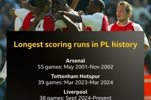 體育資訊9月15日訊 在本輪英超,利物浦1-0擊敗伯恩利,延續(xù)了球隊(duì)連續(xù)進(jìn)球場(chǎng)次紀(jì)錄。以下為英超歷史連場(chǎng)破門(mén)紀(jì)錄榜: