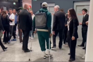 在比賽結(jié)束后,有記者拍到邁尼昂在工作人員的陪同下拄拐離開(kāi)圣西羅球場(chǎng),看上去傷勢(shì)并不樂(lè)觀。