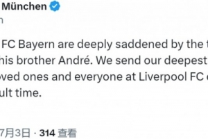 體育資訊7月3日訊 利物浦前鋒若塔因車禍離世,拜仁官方社媒致哀。
