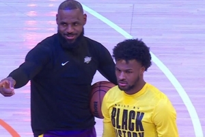 只見(jiàn)詹姆斯從場(chǎng)邊走向正在練習(xí)投籃的布朗尼,并指向場(chǎng)邊:“布朗尼,你媽說(shuō)她要叫你過(guò)去!”布朗尼則立即停止訓(xùn)練,掃視場(chǎng)下媽媽的位置。