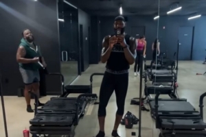 詹姆斯曬出他在當(dāng)?shù)貢r(shí)間凌晨5點(diǎn)47分在健身房與高中隊(duì)友Sian Cotton一同訓(xùn)練的自拍片段,并寫(xiě)道:“很棒的訓(xùn)練,Cott????”