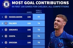 體育資訊9月18日訊 德轉(zhuǎn)曬出切爾西球員百場(chǎng)參與進(jìn)球數(shù)據(jù),帕爾默100場(chǎng)造74球,排名對(duì)視第二。