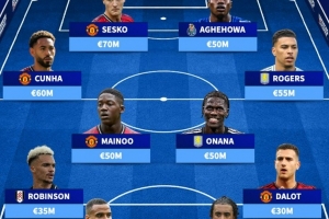 中場:庫尼亞(曼聯(lián),6000萬歐)、梅努(曼聯(lián),5000萬歐)、奧納納(維拉,5000萬歐)、羅杰斯(維拉,5500萬歐)