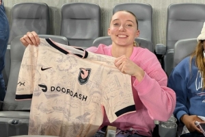 在比賽間隙,佩奇還獲贈了天使城足球為其定制的球衣。而在賽后華盛頓精神隊球員Croix Bethune(上賽季最佳新秀的)、Trinity Rodman紛紛找到佩奇并合影。