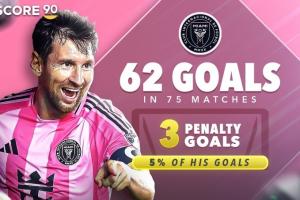 梅西:邁阿密?chē)?guó)際75場(chǎng)62球,3點(diǎn)球,占比5%