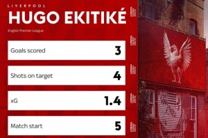 據(jù)媒體統(tǒng)計,?;倏擞⒊_局5場比賽皆首發(fā)出戰(zhàn),射正4次,預期進球1.4粒,打進3球。