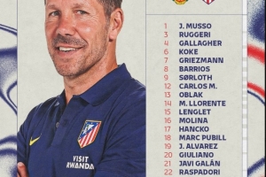 中場:3-魯杰里、4-加拉格爾、6-科克、8-巴里奧斯、23-尼科-岡薩雷斯、7-格列茲曼、27-哈諾-蒙塞拉特、28-陶菲克