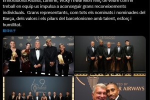 體育資訊9月23日訊 巴薩主席拉波爾塔更新社媒,祝賀在金球獎頒獎典禮上獲獎以及提名的巴薩球員。