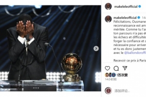 馬克萊萊曬出登貝萊領(lǐng)獎的照片,配文:“祝賀你,奧斯曼??。這份榮譽(yù)實(shí)至名歸。正如你昨晚所說,你的成長之路并不平坦,挫折與挑戰(zhàn)鑄就了你登頂所需的自信與決心,因此金球獎的獎杯正是你應(yīng)得的回報。在巴黎,在你的隊(duì)友、朋友和家人的見證下獲得這個獎項(xiàng),讓這個時刻變得更加特別。