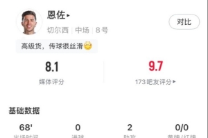 體育資訊6月25日訊 世俱杯小組賽D組第三輪,切爾西對(duì)陣突尼斯希望,恩佐首發(fā)出戰(zhàn)68分鐘貢獻(xiàn)2次助攻,獲評(píng)8.1分。