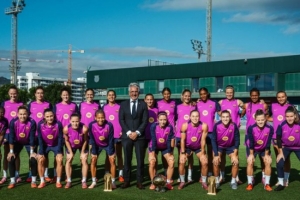 在體育城訓(xùn)練場上,巴薩女足球員們與俱樂部官員哈維爾-普伊一起合影,身旁擺放著三項重要獎杯:邦馬蒂連續(xù)第三次獲得金球獎、維姬-洛佩茲贏得首屆科帕獎以及埃瓦-帕喬爾榮獲首個蓋德-穆勒獎。