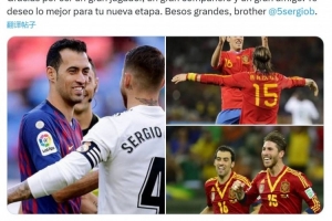 體育資訊9月26日訊 西班牙中場布斯克茨宣布賽季結(jié)束后退役,拉莫斯社媒發(fā)文,為他送上祝福。