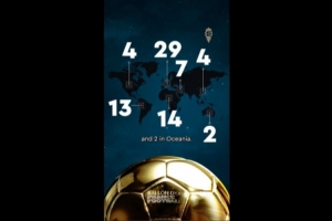 在總計(jì)100位評(píng)委中,有73人將首票投給了登貝萊,以下為各大洲具體的票數(shù)分布: