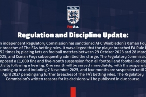 獨(dú)立監(jiān)管委員會(huì)已對AFC溫布爾登球員奧斯曼-福約違反BC條例的行為作出處罰。據(jù)指控,該球員在2023年10月29日至2025年3月28日期間對足球比賽進(jìn)行投注,違反英足總E8條例252次。