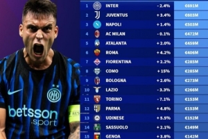意甲俱樂部陣容身價排名(單位:億歐元):