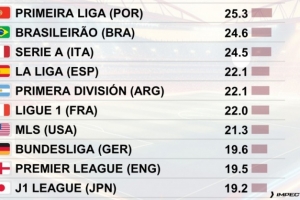 體育資訊10月13日訊 CIES足球天文臺統(tǒng)計(jì)了全球聯(lián)賽每90分鐘犯規(guī)情況,其中葡超以25.3次犯規(guī)位居榜首,巴甲則以24.6位居次席。