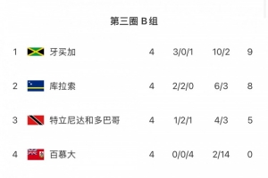 在B組第4輪較量中,此前領(lǐng)跑該小組的庫拉索1-1戰(zhàn)平特立尼達和多巴哥,牙買加則4-0大勝百慕大。本輪結(jié)束后,牙買加9分登頂,庫拉索8分第二,特立尼達和多巴哥5分第三,百慕大0分墊底。
