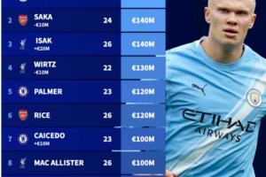 體育資訊10月17日訊 今日德轉更新英超身價,其中伊薩克漲至1.4億歐,薩卡跌至1.4億,維爾茨跌至1.3億。