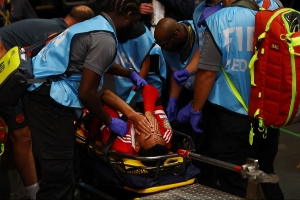 穆西亞拉被擔架抬出場時痛苦雙手掩面。
