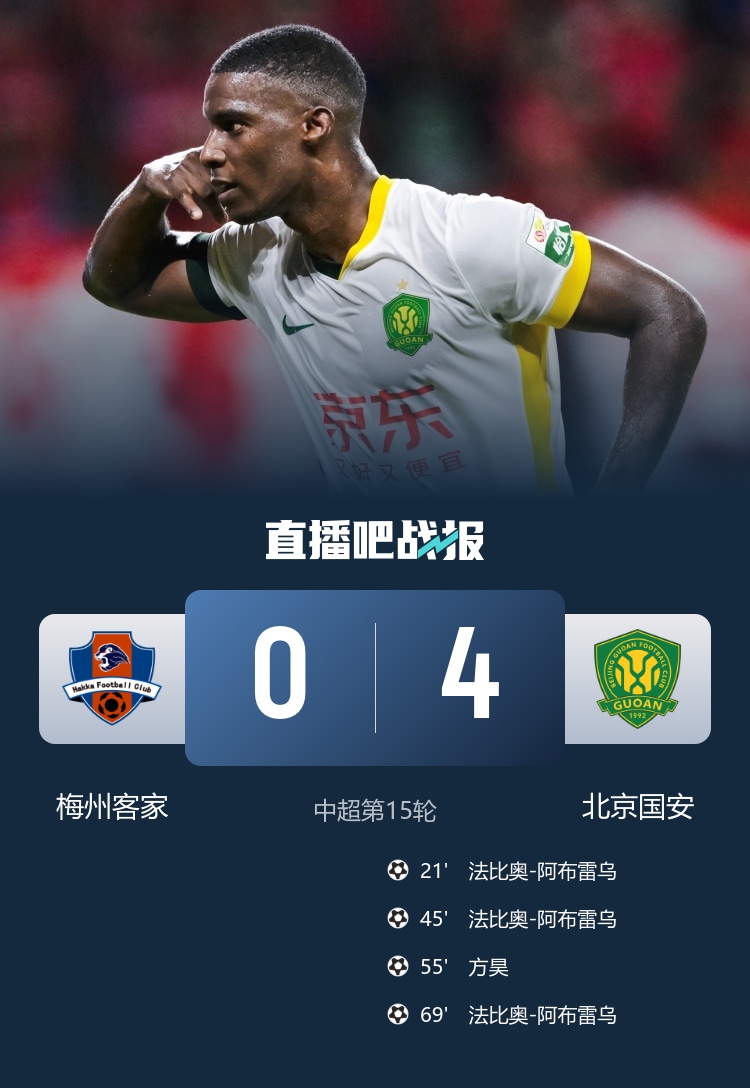 繼上賽季中超第11輪國安3-2梅州和第26輪梅州1-3國安之后,國安連續(xù)第三次在中超比賽中對梅州客家打入三球以上,這也使國安成為了第一支達成這一成就的球隊。