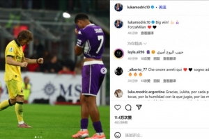 莫德里奇曬出了自己的賽場(chǎng)照,配文寫(xiě)道:“偉大的勝利!Forza Milan。”