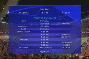 賽后兩隊(duì)跑動(dòng)數(shù)據(jù)顯示,阿森納全隊(duì)平均跑動(dòng)距離為10.28KM略高于馬競(jìng)的10.19KM。但是,在跑動(dòng)距離超過10KM的球員中,阿森納有3人,分別為賴斯(全場(chǎng)最高10.94KM)、馬丁內(nèi)利和薩卡,而馬競(jìng)僅有1人為巴里奧斯。