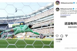 庫爾圖瓦社媒曬出撲救的照片,配文:“取勝并晉級半決賽!最后時刻有點棘手,但…????Hala Madrid”