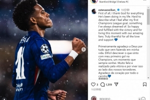 埃斯特旺社媒曬出慶祝進(jìn)球的照片,配文:“首先我要感謝上帝在我生命中的一切恩典。難以描述攻入個(gè)人首個(gè)歐冠進(jìn)球時(shí)的感受——這是我一直以來(lái)的夢(mèng)想?!?/p>