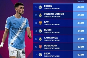 體育資訊10月25日訊 德轉(zhuǎn)盤點了在2025年足壇球員身價跌幅榜,其中福登下跌6000萬歐最多,以下為具體榜單: