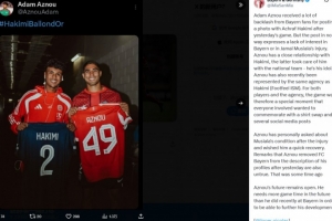 阿茲努和阿什拉夫均來(lái)自摩洛哥,兩人是國(guó)家隊(duì)隊(duì)友,后者不僅是拜仁小將的偶像,在國(guó)家隊(duì)也很照顧他。最近,阿茲努和阿什拉夫還簽約同一家經(jīng)紀(jì)公司Footfeel ISM。因此,對(duì)于兩位球員和經(jīng)紀(jì)公司來(lái)說,這場(chǎng)比賽創(chuàng)造了一個(gè)特別的時(shí)刻,大家都希望通過交換球衣并在社交媒體上發(fā)布照片來(lái)紀(jì)念。