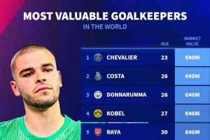 體育資訊11月1日訊 德國轉(zhuǎn)會市場統(tǒng)計(jì)了門將的身價(jià),并列出榜單,多納魯馬、科貝爾、拉亞等5人并列居首。