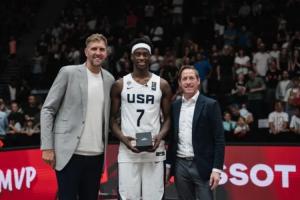 2026年?duì)钤鬅衢T、美國(guó)隊(duì)前鋒AJ-迪班薩斬獲賽會(huì)MVP,他本屆比賽場(chǎng)均拿到14.3分4.1籃板2.3助攻1.1搶斷,其中決賽得到11分6籃板2助攻1搶斷(11中4,三分3中0,罰球4中3)。