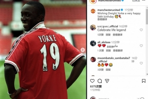曼聯(lián)官方社媒曬出約克身穿本隊(duì)球衣的照片,配文:“祝德懷特-約克54歲生日快樂?!?/p>